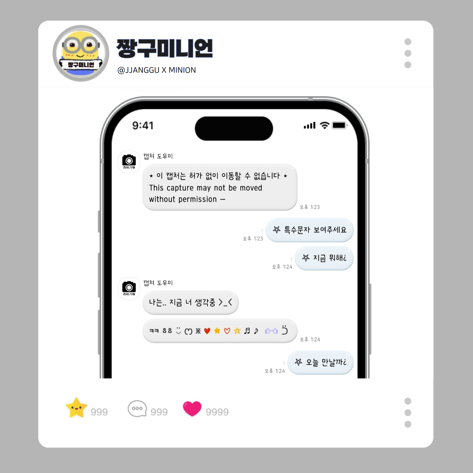[AND/IOS] 까꿍 미피 카톡테마(다운) 안녕하세요 오랜만에 포스팅하는 짱구미니언 입니다 💗💗 만들고 싶은게 너무 많아서 한 달에 두번은 카톡테마 제작해보려고 했는데 일이 너무 바빠서 그렇게 하지를 못하네요 ㅠ.ㅠ😂 아무튼 이번에는 까꿍 미피 카톡테마 만들어 봤습니다 하단바 하단바 미피가 까꿍하는 모습이에요....💗 비밀번호창 & 기본프사 메세지창 ✔️AND 다운 ✔️IOS 다운 오류가 있다면 비댓으로 알려주시면 감사하겠습니다 !!! 오늘도 좋은 하루 보내세요 💕 ᴋᴀᴋᴀᴏ ᴛʜᴇᴍᴇ 2023.09.17